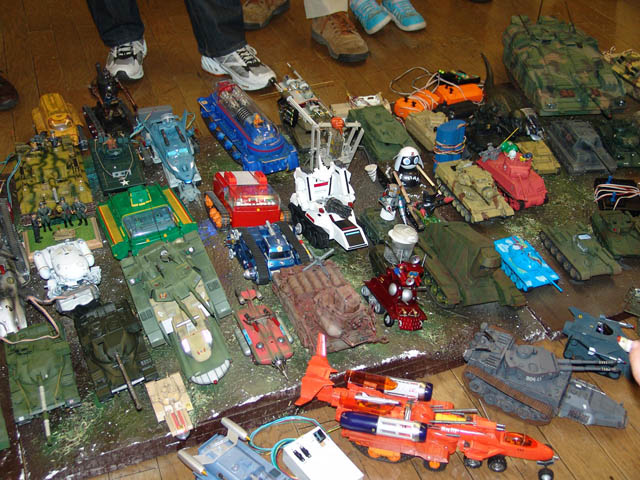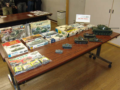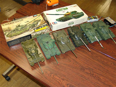 | 「動く戦車オフ会2005」にずらり並んだオールドキット群。みんなオカシイ・・・(^_^;) 前列:キングタイガー(初版×2台)、T34、ツインフラック、T10、チーフティン(初版自動変速)・・・ 中列:AMX30ナポレオン、オオタキキングタイガー、タミヤパットン・・・ 後列:T92、ニチモチーフテン、センチュリオン、ニチモW号H型、G型(いずれも1/30)・・・ |