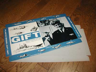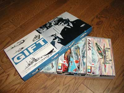 | このところ完全に枕詞になってしまい恐縮至極です。「本当に久々の更新です。お待たせしました!」 あれはちょうど1ヶ月前のことでした。当研究室と親交のある高島さんから「こんなのどうですか」という表題が付いた画像添付メールが届きました。「何時も行っている模型屋からこんなものが出て来ました。もうお持ちだとは思いますが一応念の為写真を送ります。」開いてみてびっくりです。確かに見覚えのある船員さんの写真ですが、それが印刷され横には“GIFT”の文字が見えます。どうやら何かの箱のフタを展開したもののようですが、タミヤにギフトボックスがあったなんて初耳です。 すぐに「こんなの初めて見ました!凄いですね」と返事を出したところ、驚くべき続報が届きました。「勿論このギフトセット用未組立新品箱(?)はプレゼントさせて頂きます。ぜんぶで○セット出て来ましたので3セット送ります。」「!!??」 といったわけで、なんと3セット(上下箱)も頂いてしまったのです!タミヤ本社に現存していないのは明らかですので、高島さんの意思にそって1セットは静岡タミヤ本社へ寄贈し、残りの2セットのうち1つは組み立てて公開し、1つは保存用とさせていただきました。 ちょうど幕張メッセでプラモデル・ラジコンショーがあったので、タミヤブースへ直接持ち込みました。幸運にも俊作社長に直接お話できる機会を得たので聞いてみました。「これはまた凄いものが出てきたね。う〜ん、あんまり記憶にないなあ。でもボックスサイドの“PLASTIC MODEL GIFT SET”という文字は、僕がレタリングしたんだよ。それは覚えているからなあ。確かこれはこの中にキットを詰めて静岡から発送したんじゃなく、箱だけを販売店に配って、各々の販売店でキットを入れてもらったんじゃなかったかな。」との証言を得ました。先の模型店のご主人の証言によると、1/72フライトシリーズなどを3個詰めたそうです。模型店の倉庫から未組み立ての箱が見つかったことからもわかるように、やはり個々の模型店で独自に梱包していた模様です。 ところでこのギフトボックスで販売された時代特定ですが、隼の完成品を持った船員さんの写真が撮影されたのは1964年の秋であるのは、すでに撮影者である俊作社長の証言ではっきりしています。事実、1965年版総合カタログの表紙にもなっています。このギフトボックス自体にタミヤのロゴマークが無いので、一瞬「三ツ星などが配り、他社のキットも入れたのか?」とも思ったのですが、ボックストップやボックスサイドの線画イラストがすべてタミヤ製品ですのでその疑いは消えました。その線画イラストはボックスサイドには左から、零戦、隼、五式戦、震電が描かれています。ボックストップには同じく隼、零戦があり、クルセーダー、鈴谷もあります。この中で一番新しいのは1965年4月発売の震電ですから、このギフトボックスは1965年の夏以降に配られたことがわかります。ちょうどロゴマークの切り替えの時に重なりますので、このギフトボックスに一切のロゴマークが無いのはそんな理由もあるのかもしれません。ギフトボックスといえば1950年代半ばにはアメリカRevell社が既存のキットを詰め合わせにして新しい箱を作りギフトセットと称して豪華さを醸 し出していましたが、その回帰現象だったのでしょうか? 基本に立ち返りますが、このギフトボックスに詰めることが出来たキットは時代背景も考えると次のようになります(すべて¥100のキットですね)。 1/72フライトシリーズ(零戦、鍾軌、雷電、疾風、震電) ワールドタンクシリーズ(ハンター、スターリン、デストロイヤー、ロングトム、クルセイダー、チャフィー) チャンピオンシリーズ(サーブ1、スーパーファースト、ジャガーD、ニューエルバ) ¥120で発売されていた魚雷艇シリーズもどうかな?と思ったのですが、こちらは微妙に箱の高さが高く、また横幅も小さいため入れなかったものと考えられます。もちろん、このギフトボックス自体に描かれていた1/50フライトシリーズの五式戦や、1/400重巡洋艦シリーズの鈴谷は箱の大きさが合わないため入りません。 今回、実際に35年の歴史を越えてギフトボックスを“組んで”みたのですが、キットを3個入れて手にするとずっしりとした重さがあり高級感があります(定価は¥300なんですけれど)。これを買ってもらった当時の子供たちの喜びはどんなだったんでしょうね。 最後になりましたが、素晴らしい研究素材を事も無げに3個も贈って下さった高島秀一郎さんに、改めてこの場を借りて感謝いたします。ありがとうございました。 (2001/10/25) |