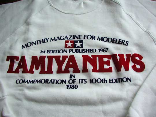 | 「タミヤニュースの世界」発売日記念です。ちなんだ物を紹介しましょう 1967年1月号の創刊以来、タミヤニュースは1980年10月号で通巻100号を数えました。実質月刊誌になったのが1979年。100号までは殆ど隔月誌扱いだったので13年もかかったのですね。そこで読者プレゼントとして記念トレーナーが作られました。 正直申し上げて、この告知を当研究室助手は原体験としてあまり覚えておりません。時期を逆算してみると、大学受験まっただ中の高校3年生の秋だったことが判明しました。人生で一番勉強していた時期に、とりあえずタミヤの最新情報だけはと見ていた程度ですので記憶が薄いのでしょう。 そんな中、今回の「タミヤニュースの世界」の編集過程であらためて新製品案内のページを調べていくと、Vol.100にこの記念トレーナープレゼント告知記事を確認したのです。「えっ!こんなのがあったの!?」というのが正直な感想です。しかしよくよく読んでみると、全国でたった100人にしか渡らない超レアな非売品です。さらに「ご応募はお1人様ハガキ1枚に限ります」と書いてあるではないですか! こんな厳しいプレゼント品がかつてあったでしょうか?捜そうという気力も萎えるほどの衝撃です。しかし、「タミヤニュースの世界」という本を出版するに当たってこの100号記念トレーナーの写真があると無いではマニアの方々の満足度が違うだろうなあと思うと、当選者として只一人公開してある福島県の清野さんという方を104の電話番号案内で捜そうかと考えたほどです。念のため静岡のタミヤ本社にも在庫の確認をしたのですが「残ってないですねえ」との返事。そもそもタミヤニュースの文字告知原稿しかないのでどんなデザインかさえわかりません(それもそのはず、当選者が決まってもこのトレーナーが完成していなかったのですね)。正直、あまりにもレアすぎるのできっぱりとあきらめました。 月日は流れ「タミヤニュースの世界」用のタミヤグッズの撮影も終了し、すべてのカラーページのレイアウトも終えた4月中旬のある日、当研究室助手は某インターネットオークションのサイトをチラチラ見ているときに「え?」と固まってしまいました。そこには小さなサムネイル画像でタミヤマークの見たこともないトレーナーが出品されていたのです。 出品物の名前は「タミヤ スウェット サイズL 未使用品!!」。品物の状態についての説明はありますが、そもそもこれはタミヤの“何の”トレーナーかといった記述は一切ありません。はやる気持ちを抑えて画像を拡大すると、そこには“TAMIYA NEWS COMMEMORATION OF ITS 100th EDITION”の文字が読みとれるではないですか!!!うぁあああああああああ!!%#!§ &!!!... 落ち着け、落ち着け...と気を引き締めて、入札の作戦を考えます。しかし答えはすぐに出ました。どうしても欲しい!だからすぐに入札だ!!(全然落ち着いてないですね)。結果的に合計3人の争いになりましたが、意外にも一人はハンドルネームや過去の履歴から見て若い女性。もう一人もオークション初心者で過去の履歴はマフラーや靴を買っている人。そう、タミヤ製品を過去に落札している人はいませんでした。そしてとてもリーズナブルな金額で落札決定!(○倍以上の金額を入札していたのはヒミツ)。カラーページの締切は終わっていましたが白黒ページの画像の締切が3日後です。出品者にお願いしてトレーナーを直接ネスコに送ってもらい、写真撮影して滑り込ませました。ちなみに最大の疑問を落札後に出品者に問い合わせたのですが、出品者は古着屋さんで、どこから入手した物かわからないとのことでした(この説明が一番納得する選択肢だったかもしれません)。 (2001/05/25) |