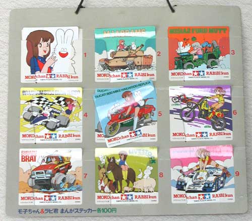 LOVE TAMIYA」展ではその中から150点程を展示します。衣料品・文具が中心になりますね。「タミヤニュース100号記念トレーナー」や「ディレクターズチェア」は、今ではなかなか見られない物です。 比較的(?)若い世代の方々の為には「モ子ちゃんグッズ」の中から厳選して展示してあります。「モ子ちゃんじゃんけんシール未使用完全版(あうとばぁんさん提供)」、「藤田幸久先生直筆モ子ちゃんイラストハガキ(1982年モノ)」などはかなりのレアもの。「モ子ちゃんハガキ」、「モ子ちゃんステッカー」、「モ子ちゃんカレンダー(すいません、初版1986年のみです)」その他モロモロお楽しみください。 |