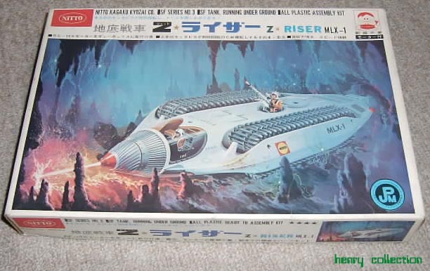 | 昭和40年代に一世を風靡したオリジナルSF戦車プラモデル・・・オリジナリティーあふれるアイデアとデザインは改めて現代の目で見ても驚くばかりです。当時のオリジナルキットを組むとなると大変な決断がいるのですが、ここは自分で工夫して創作してみよう!という試みが21世紀に入って行われています。2001年「俺タイガーキャプテンコンテスト」、2002年「俺クローラーコンテスト」と来て、2003年は「俺Zライザーコンテスト」となることが2002年11月に決定しました(「俺」と付くのは、「俺様(?)が作った独創的な作品はこれだ!」という意味合いがあります・・・たぶん)。 「Zライザー」とは日東科学が1967年に発売したキットで、世界的に有名なあの長岡秀三氏のデザインです。キャタピラが片側に上下2本、左右合計4本もあり(ふとんの中を走らせても貫通したそうです!)、先端には螺旋ドリルもついています。キットの初版は1970年の声を聞くかどうかのところで絶版になってしまったのですが、1975年にクリアーパーツをふんだんに使った形で「ジャイアントショッカーマシン」として再販されました(仮面ライダー全盛期ですのでネーミングにも影響が)。この時、動力はゼンマイになり、キャタピラも4本ではなく、ぐるっとまわった片側1本の左右2本となります。この結果、裏返しに置くと逆走するようになってしまいました。その後1983年に「限定再販」として「ジェットライザー」の名前で再販されました(それでも、もう20年前なんですね)。「イラストレーター長岡秀三(秀星)メカニックデザイン」と明記してありますので、多分にかつての少年世代を狙った販売と思われます。この「ジェットライザー」が1975年以降販売されていたかどうかは、現在のところ不明です。こちらは現在でも比較的良心的な価格(といってもそれなりにしますが)で入手できると思われます。 2003年はこのオマージュで決まり!のはずだったのですが、より門戸を広げようということになり、「俺ドリル戦車コンテスト」となりました。こうなると往年のミドリのドリル戦車も出てきますので夢が膨らみますね(^_^)/。 |