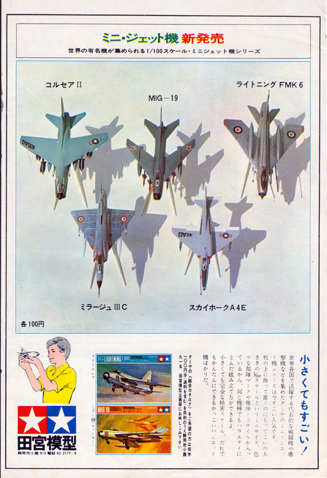 | 当時の子供たちにとってのベストセラーである少年サンデーにいきなり登場したカラー広告。 1/100というミニサイズながら、明らかに子供のオモチャでは無いことがわかります 左下に小さく書かれた「各100円」という文字は朗報だったでしょう。 それにしてもミグ19にライトニング・・・いま見ても最初からマニアックです 市場調査なんてやっていたのでしょうか? かつて田宮俊作会長に「どうしてナポレオンなんていうマニアックな戦車を出したんですか?」 と聞いたら、「だってカッコイイじゃない」と言われてとても興奮したのを覚えています 今のオトナの眼ならミグ19のカッコよさはわかるのですが 当時はどうだったんでしょうね??? |