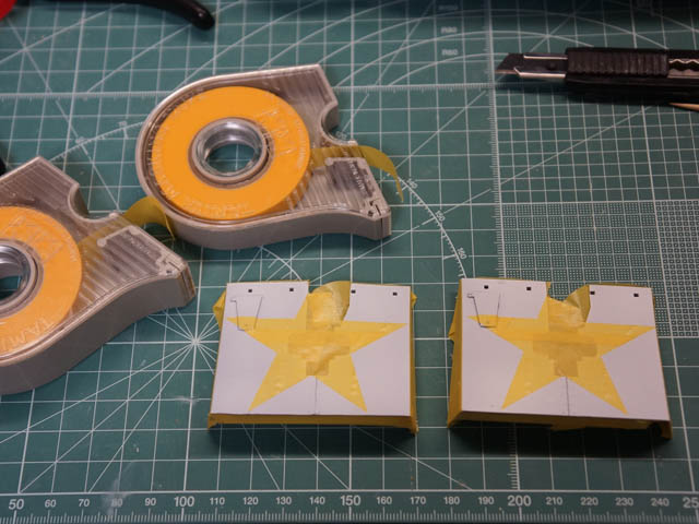 | あらかじめ白色塗装した防盾にカットしたマスキングテープを貼ります。 簡単に見えますが、以外に凹凸部分の微調整が必要です。 |