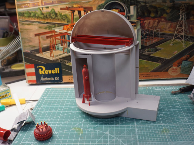 | 基本となる原子炉格納容器を組んでいきますが、パーツの精度がよくありません 光硬化パテを駆使しながら平面と垂直を出しながら進みます。 |