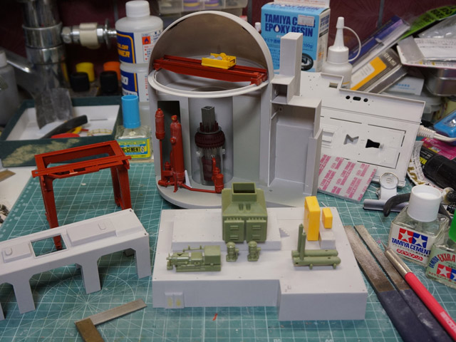 | 原子炉建屋はなんとか目処が付いたので、いよいよタービン建屋なのですが、これがまた難解な部分です。それもあってかどうか、静岡の疲れがあったかどうか、中々進みません。 各パーツごとに色分けされていてエデュケーショナルモデルの様なのはいいのですが、いかんせん組み立て説明書がわかりにくいのです。どこにどのような角度で付くのか、接着後はどうなるのかが描いてない部分が多々あるのです(このためあとで大きなミスをします)。ネットで先人の方々が作られた完成品画像をダウンロードし、拡大して参考にもしましたが、やはりわからない所はわかりません。後の塗装の効率性を考えて接着するところと、この時点でははめ込みにするところを計算しながら進めます。 ところでこの週末も大きなイベントが入っていて東京を離れることになっていたのです。3ヶ月も前に決めていた母や姉、それに自分の家族を連れての京都紅葉観光です。ここは腹をくくって観光を堪能しました。 (2014/05/10) |
