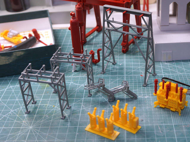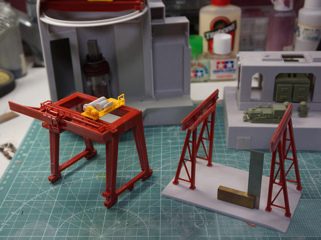 | 大型クレーンはとても良いプロポーションですがパーツの合いが悪く苦労しました。 画面右側のスコヤと呼ばれる直角定規が活躍します。 |