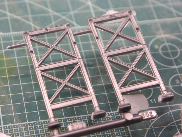 | 鉄塔のパーツもご覧のようにバリ、突き出しピン跡、パーティングラインのフル装備です。 |