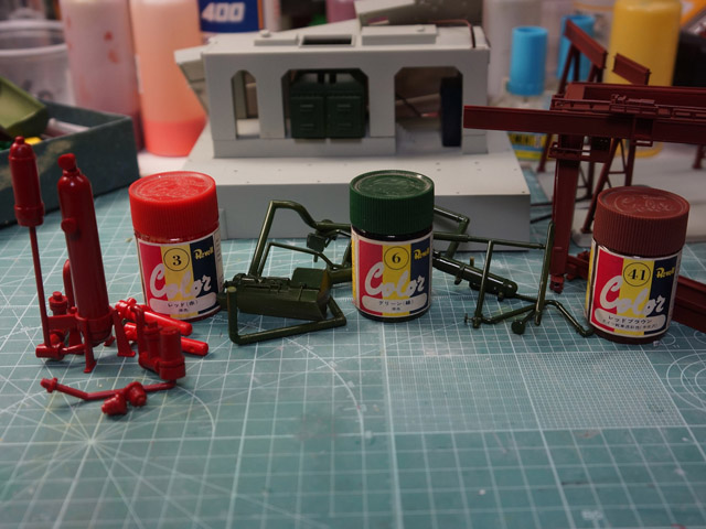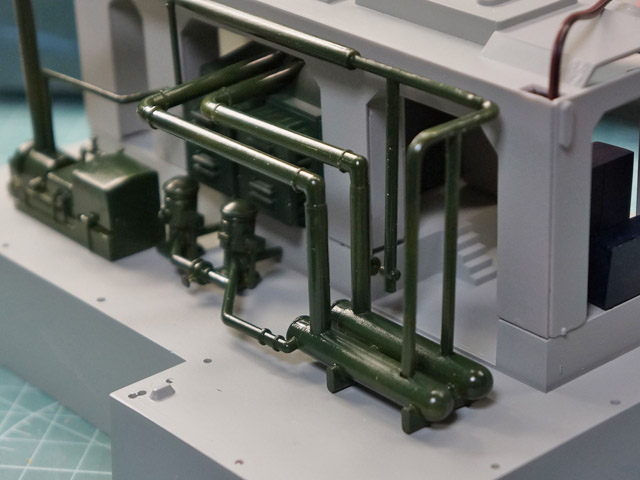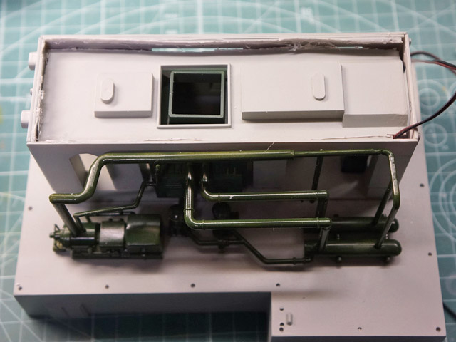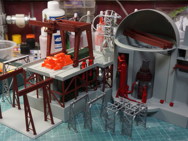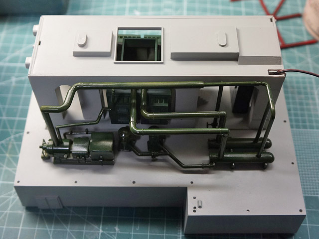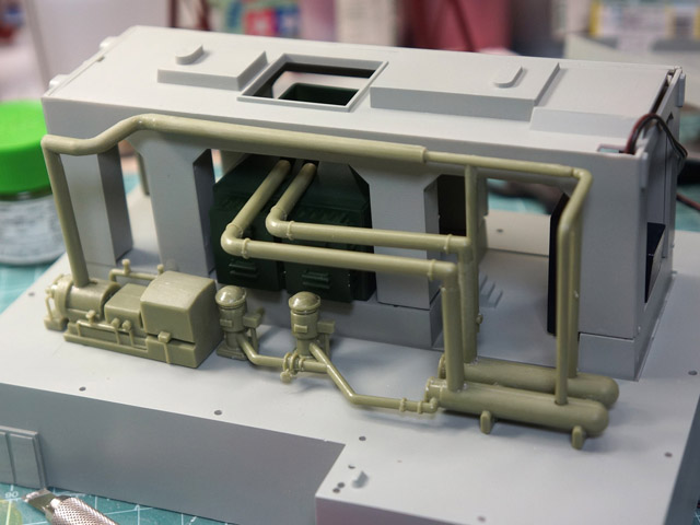 | レベルカラー6番の「緑」単色です。なんとも深みのある良い色です。 現在のクレオスカラーは色味が変わって、もっと鮮やかな色になりました。 右端に見える配線はタービン建屋天井裏に組み込んだLED用です。 |