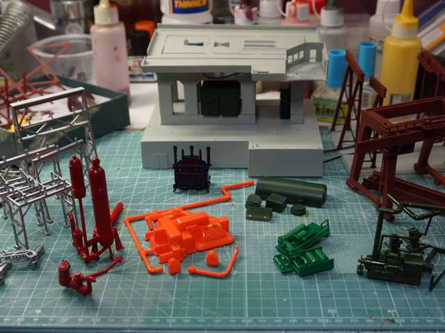 | タービン建屋1階のポンプやタンク類。簡単に見える配管の取り回しがかなり厄介。 後の塗装を考えて、この時点では接着せずに仮組みです。 |