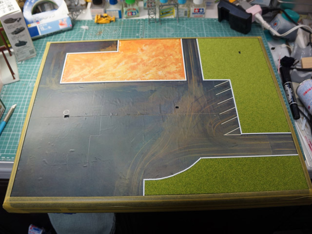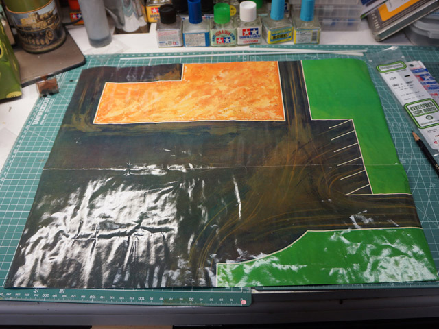 | スチレンボードにピタッと貼れました。芝は人工芝に差し替えです 地面の多少の凸凹はこのあと微調整しますが、このテカテカのツヤをどうするかです |