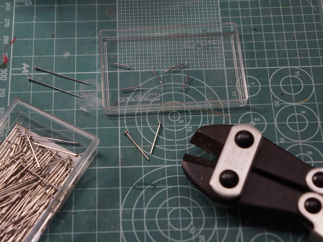 | 今ではなかなか見かけなくなった「虫ピン」をワイヤーカッターで切断。 |