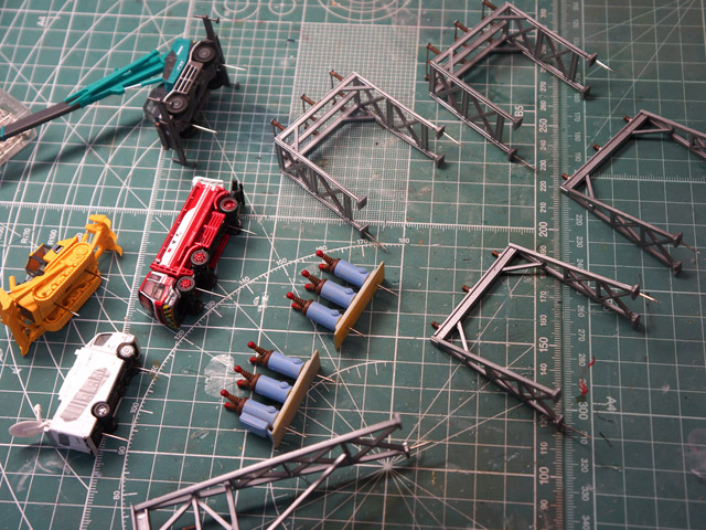 | 小物類も全て虫ピンを固定していきます。車両は現代の鉄道模型用をコラボ。 |