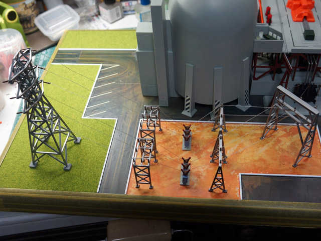 | ここまで来れば完全にゴールが見えました。タービン建屋と原子炉建屋を台座に固定する方法を考え、オーソドックスに虫ピンで固定することにしました。虫ピンとスチレンボードの相性は見事なもので、吸い付くように固定されますが、念のため透明樹脂接着剤も使いました。ちなみに虫ピンは非常に硬い素材で、普通のペンチなどでは刃が欠けてしまう恐れがあるのでワイヤーカッターを使いました。 今回は1/144スケールということで鉄道模型用の小物が使えます。この1ヶ月ほど前からコツコツと集めていたものを惜しげも無く投入しました。 最後に待っていた難関は送電線です。最悪ナシでもいいかな〜とも考えていたのですが、頑張ってやってみて良かったです。この送電線もキットに同梱されていました。素材は銀色の樹脂と糸の混紡とでもいいましょうか、ご覧のように非常にリアルなものです。しかしこれが1本でも緩く垂れ下がってしまっては興ざめです。しかし現代は瞬間接着剤という文明の利器があるのです。焦らずに1ヶ所1ヶ所確実に順番に留めていくことでご覧の状態になりました。しかし瞬間接着剤が無かった当時は、それぞれ縛りながらでも進めるしか無いのですが、すべてをピンと張るには相当高度な技術が必要だったと思われます。 (2014/05/13) |