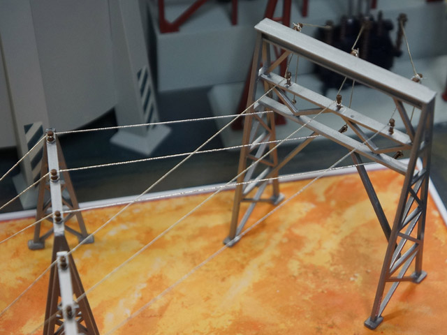 | 送電線もキットに付属の銀色樹脂と糸の混紡製! これは現代の瞬間接着剤がないとピンと張れません。昔はどうやったんでしょう? |