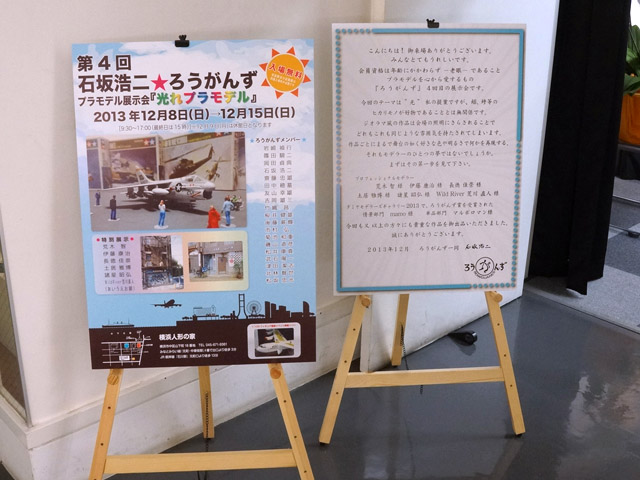| いよいよ展示です。模型サークル等に入っていらっしゃる方は経験なさったこともあると思いますが、メンバーがどんな作品を持ち寄るかワクワクしますよね。 毎年12月に「横浜人形の家」で開催されている「石坂浩二☆ろうがんず展」も4回目を数えました。何事にも目標があるというのは良いことです。お客さんも場所柄、偶然通りかかった方も多く「まさか石坂浩二さんご本人に会えるとは思わなかった」「塗装体験コーナーもあって、とっても楽しかったです」と好評です。「横浜人形の家」自体は入場料がかかる建物なのですが、「ろうがんず展」は有料ゲート手前にある多目的室で開催されているので入場料もかかりません。是非機会があれば訪れてみてください。 その「ろうがんず」の公式HPが出来ました!2014年5月18日に重大発表がありますのでお楽しみに! (2014/05/13) |
