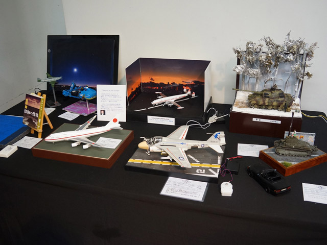 | テーマごとの会員の作品。全て光ります。右奥のキングタイガーが石坂会長の作品。 まさかのAFV作品に会員も驚きました!戦車兵が持つライトが光ります。 |