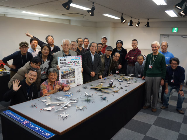 | この時のもう一つのテーマ「1/100ミニジェット愛コンプリート」展の前で記念撮影。 |
