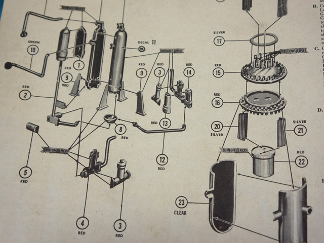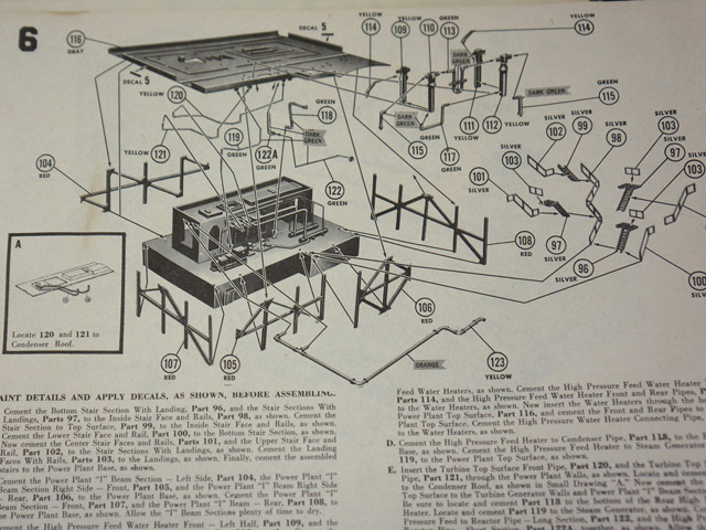 | 一応屋根はあるけど衝撃のオープン状態のタービン建屋。 右側の12個の部品からなるクネクネしたものは手すり付きの階段ですが この図一枚だけで、どこにどう接着し、最終的にどんな形になるか図示されていません。 配管もどこに繋がるかわかりますか?これを完成させられた子供は果たしていたのでしょうか? 一つ一つのパーツに番号があり、下に英文の説明があるのでとても勉強になりますが・・・。 |