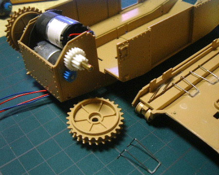 | タカダさんが2台作る間に、B1の駆動系とサスがやっとかたちになりました。 サスは、ピアノ線で1輪ずつ溝を彫ってL字の先端を転輪に当てましたが、予想通りストロークは1mm。シャフトギアードモーターでスケールスピード時速10Km程度と、模型も製作ペースも実車以上のスローモデリングです。しかし全然飽きない! この戦車の不思議な魅力は、悪役1号ばりのリベットだらけのノスタルジーなボディーが、現実に重戦車として活躍したところのギャップにあると思います。タミヤの車種選定・可動履帯は素晴らしい!今夜はWCフランス戦観がてら、フランスワイン飲みがてら、フランスタンク作りを楽しもうと思います。 2006/07/01(Sat) 23:32投稿 |