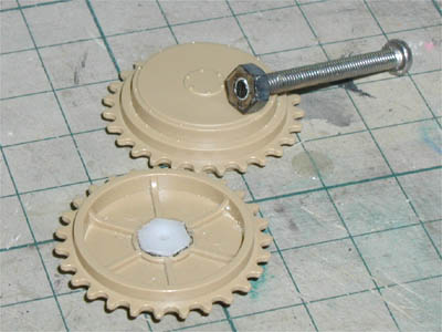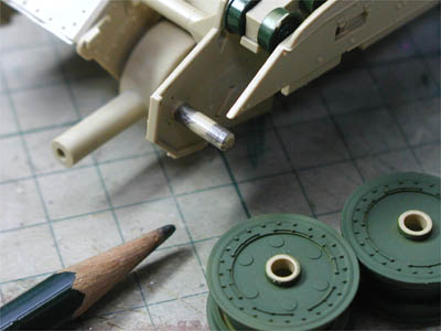 アイドラーホイルはポリキャップをはめず、鉛筆でこする。 ちなみにこれは失敗画像。この後強引に・・・ サイドスカートを取り付ける前にロードホイルはつけましょう |