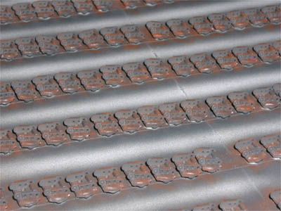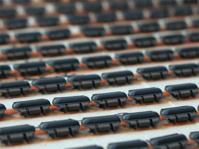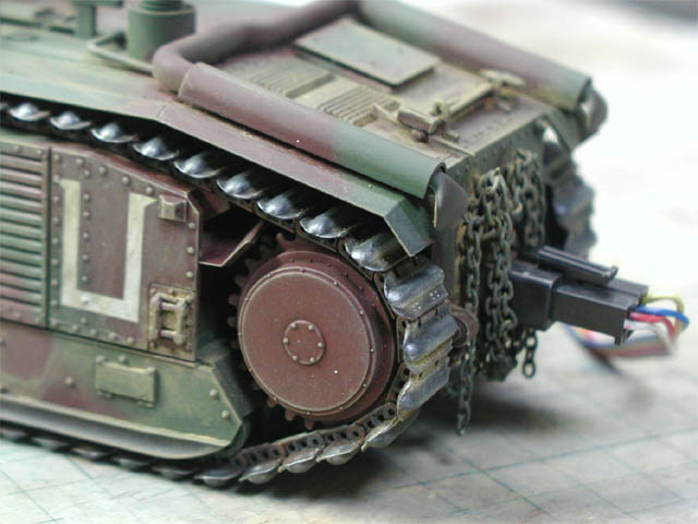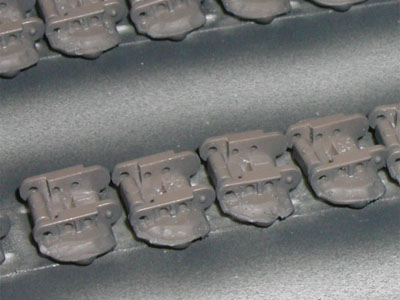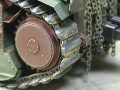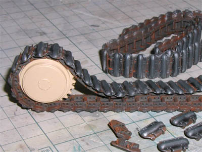 | キャタピラを両面テープで並べてエアブラシ塗装 エッジをリューターで削ると、さらにリアルになった |