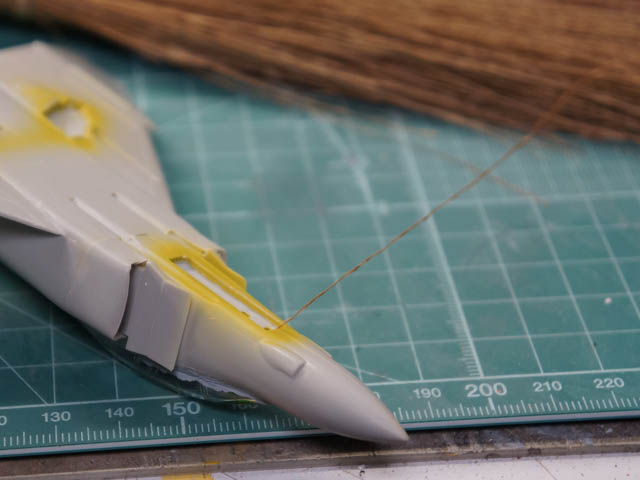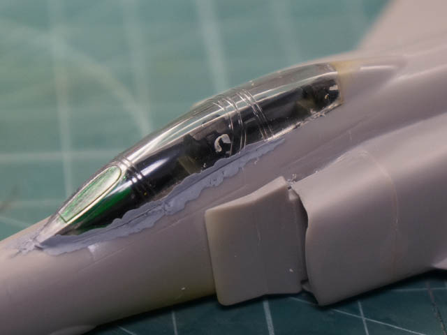 | いい感じで追い込みに入っていたら、トラブル発生!!! ガッチリ接着した後にキャノピー内にプラスチックの削りカスが入ってしまいました(涙)。 どうやって取り除くの・・・・・・・ |