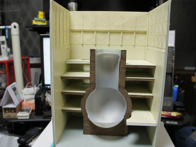 | この日が日曜日で翌日以降が平日ですので、まとまった時間が取れるのはこの日しかありません デジカメの撮影時間を見ると早朝から深夜までひたすら作っていたことがわかりますが、かなり追い込まれていた様で、日中の作業画像がありません。当然この日には塗装を始めていないととても間に合わないのですが、まずはコンクリート色に使え、サーフェイサー(下地塗装)の役割も兼ねて欲しい思いで灰色をエアブラシしました。色は自分で柏崎刈羽原発の内部で見た色のイメージで明灰白色という旧日本海軍機の色を選択します。いわゆる零戦の色です。 最近は乾燥ブース(食器乾燥器)で乾燥させることがほとんどなのですが、今回は大きすぎて乾燥機には入らないため、十分に時間を取って自然乾燥させました。その後、地下1階の床のみマスキングして、壁の色としてスカイ色をエアブラシします。これは柏崎刈羽建屋内で実際に自分の目で見てきた壁の色そのものでした。実際に上がったオペレーティングフロアは床に化粧板が貼られ、壁と同じスカイ色だったので、コンクリート打ちっぱなしの地下1階以外は全てその解釈にしましたが、後に修正を余儀なくされます。 今回作っているのは建屋を南北方向に切断したカットモデルです。断面はコンクリートの材質に見える工夫としてタミヤの情景製作用の新素材テクスチャーペイントを使ってみました。あいにくコンクリート色が手に入らず茶色の「土表現用」でしたが、最終的に塗装するので気にしません。しかしここでこの新素材の特性をわからないままいきなり本番に使ったため、これまた後に修正を余儀なくされることになりました。それは乾燥時間と、食いつきの良さが原因なのですが半日近くを無駄にしました。 今回の一連の作業の中で初の塗装工程なので、これまで複合素材で何が何だかのバラバラの表面が初めて統一された感じが出て来ました。圧力抑制室は透明塩ビでなんだか軽々しかったのがいきなり溶接の質感が出て来ます。透明アクリルパイプに塩ビ水道管継ぎ手で、質感に欠けた圧力容器もすっかりイメージが湧いてきました。 床と壁はスチレンボードなのですが、床材には0.3mmのプラバンを貼ります。これは塗装の食いつきを良くすることと、表面の材質の統一性が大きな目的です。5階のオペフロも新造し仮組みを終えてから塗装しました。 (2014/01/14) |