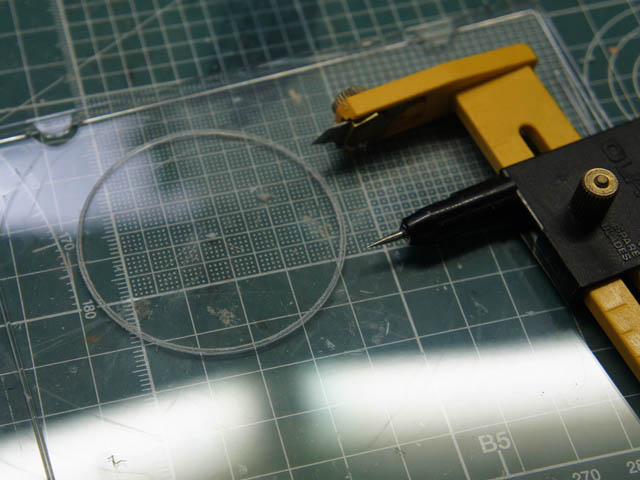 | 圧力抑制室底部に貯められた水の再現です。 厚みのある透明プラスチック板として目の前にあったDVDケースをサークルカッターで切断。 |