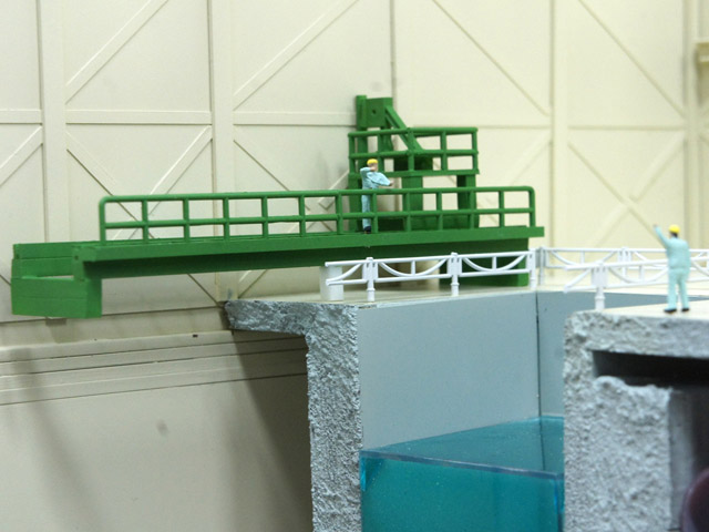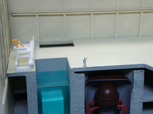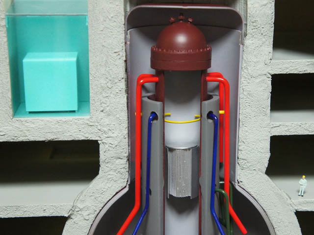 | 全体の塗装を終え、同スケールの作業員の人形を置きます。 柏崎刈羽の建屋に入ったばかりでしたので自分では理解しているのですが 予想通りこのスケール感は大きな反響を呼びました。 ※ この模型は事故前の平時の再現なので、今から見れば使用済燃料プールの水位が 低すぎることがわかります。燃料集合体の長さ(高さ)の倍以上の深さは必ずあります。 事故の時は3号機、4号機でこの水位がわからず深刻な問題になりました。 |
