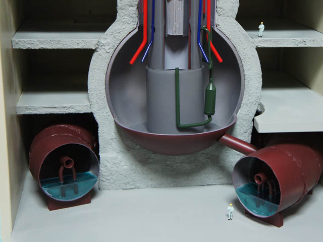 | 巨大なフラスコ型の容器が格納容器。緑色の配管は循環用のジェットポンプです。 |