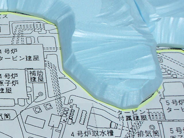 | ようやく休日になり、1日中作業をする事が出来ました しかし、そんな中でもサクサクとは行きません ずっと悩んでいたのが敷地平面部分と山部分の噛み合わせです 浜岡原発の平面敷地は標高6〜8mですので 1/2000スケールでは3〜4mmになります そこで3mm厚さのスチレンボードを用意して敷地平面とし プラペーパー貼りで悪戦苦闘していたわけです 仕上げの綺麗さを考えると シーナリーパウダーやウレタンなどを使う山部分は どうしても製作時に粉やゴミが出てしまい 無機的な平面のコンクリートとアスファルトになる平面部分に 余分なダストが飛び散るのを避けたいのです そこで、別々に製作して最後に合体させるつもりなのですが 3mmスチレンボードに山を乗せるか スチレンボードは平面部分だけにカットして 山部分もそれに沿ってカットし、別に地面から立ち上げるか悩んでいました 後者にするつもりだったのですが 例によってピタリと曲面切断面を合わせるのは至難の業だという事に気付きました 1mmでも隙間が見えるとガッカリです といったわけで、前者に変更・・・ つまり、山部分を3mm標高を下げます コレが大工事になってしまいました ・・・こんな事の繰り返しです そして、ずっと悩んでいた「山の中にある道」の表現です 私の所有しているスチレンカッターは ニクロム線が直線の大型の物だけなので細かい作業が出来ません 試しにカッターナイフを使ってみたのですが すぐに引っかかってしまいます そうだ、アレを使ってみよう! 結果は大満足。もちろんまだ荒削りですが 仕上げの時に考えれば何とかなるでしょう (2011/10/23) |