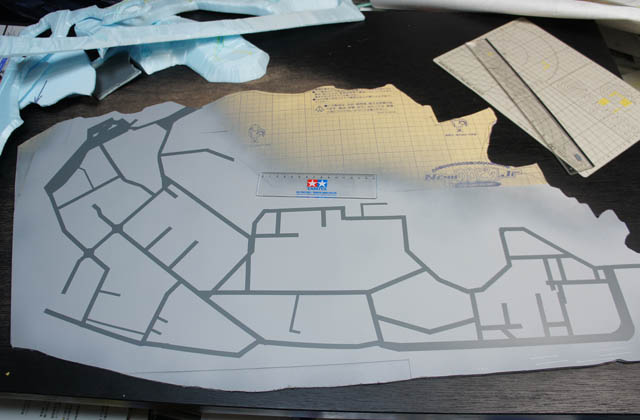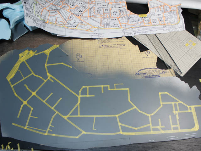 | 道路のマスキングは思ったよりずっと楽でした。 エッジは雲形定規なんかを取り出して切り落とし・・・ |
