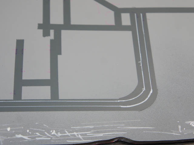 | あ、はみ出た あ、急に太くなった あ、出ない そうなんです、無理やりペン軸を細く加工したので 最初はいいんですが、すぐに乾いてしまうのです ・・・・ ど、どうしよう これだけマスキングも全部終えてからやったのに さすがに目をつぶれないよな〜 白線はあきらめるしかないな・・・ |
