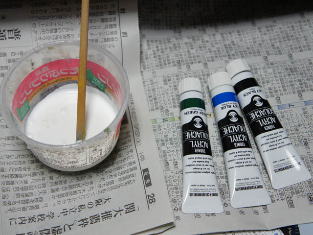 | ここでまたまた、かねこ師匠の電話アドバイスに基き 木工用ボンドとアクリルガッシュを用意。 |