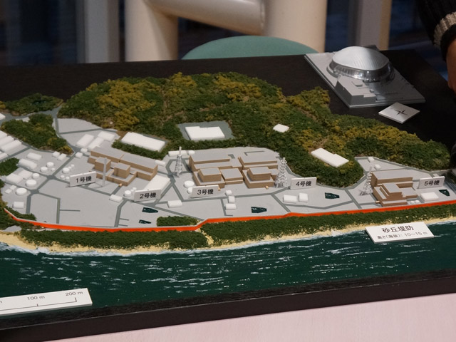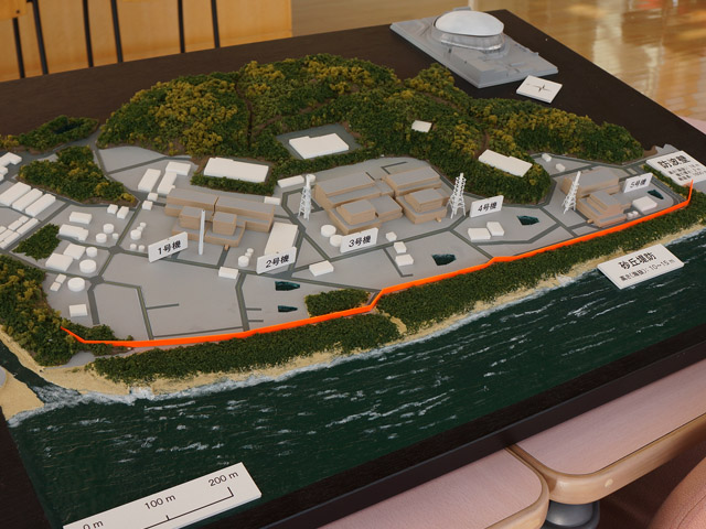 | 実は浜岡原発に関しては中部電力から2012年12月20日に「防波壁の高さを4mかさ上げする」と発表がありました。南海トラフの予想津波高さがより高いものに想定されたからです。 実はこの1ヶ月ほど前に静岡朝日テレビさんから「昨年の震災特番にあたる第二弾の特番をやることになったのですが、静岡ホビースクエアに展示してある浜岡原発の模型をスタジをで再び使っていいですか?」と聞かれて快諾していたのです。すぐに担当者に電話しました「スタジオ収録はいつでしたっけ?」「今週末ですが、何か?」「いえ、中部電力からかさ上げが発表されたので模型を作り直さないと!」「え!?」 報道番組で使う模型は「わかりやすさ」を求められるのは当然ですが、可能な限り「正確さ」が求められます。特に新たな津波対策としてかさ上げ計画が発表されたのなら、正確に再現しないと、どちらか一方に偏っていると取られかねません。「明日、静岡にうかがいます!!」「え!?」 この模型の縮尺は1/2000に正確に再現しました。縦横方向だけでなく高さもデフォルメはありません。4mのかさ上げとなると1/2000の模型ではぴったり2mmのかさ上げになります。厚さが2mの防波壁のかさ上げだから、模型では1mm厚のプラバンで2mmの高さを足すだけだから30分もあればすぐ出来ると思ったら大間違い。かさ上げは厚さ2mではなくもっと薄いものにナナメに衝立を並べる形式だというのです。この状態を正確に1/2000の模型で再現するのは無理なので、高さの2mmを正確に再現し、ベースとは違う形式のかさ上げということをわからせる再現にしました。 3時間ほどで追加作業は完了。無事に翌日のスタジオ収録にも間に合いました(番組を見てかさ上げに気付いた人は何人いらっしゃるのだろう)。発表から2日後の突貫工事(?)の完成でしたが、当研究室のUPには1年以上かかってしまったことをお詫びいたします。 (2014/01/06) |