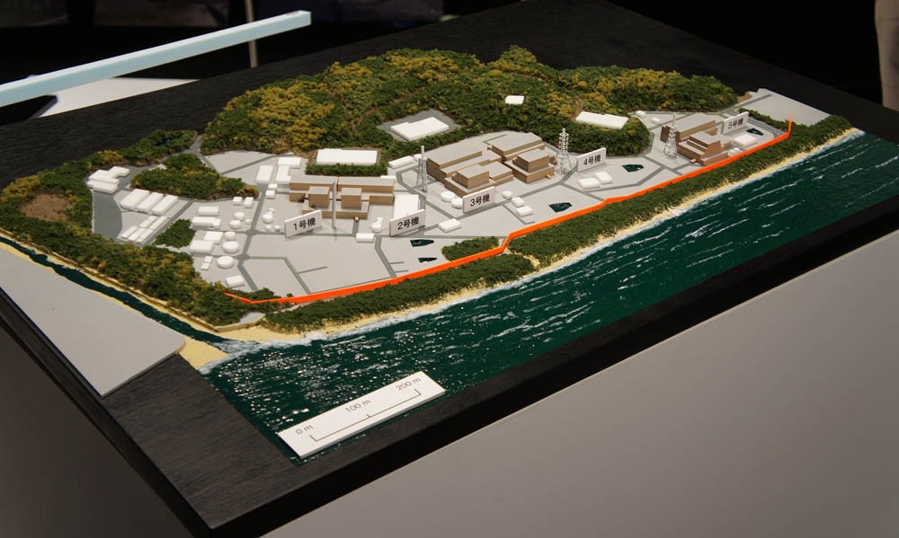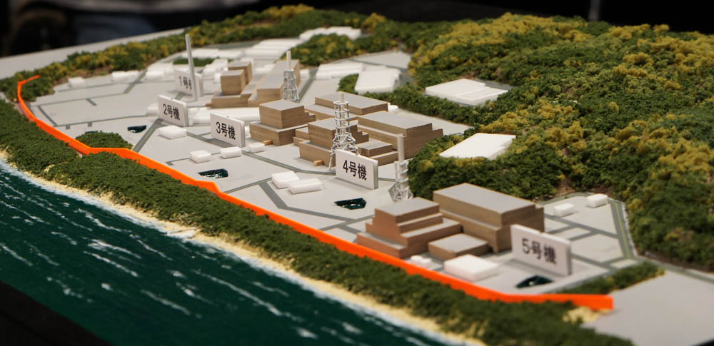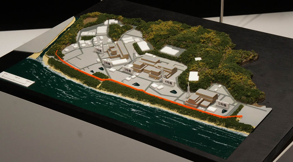 | 海岸にほぼ垂直方向から見た浜岡原発です。「防波壁」は高さも厚さも正確に1/2000で再現されています。 |