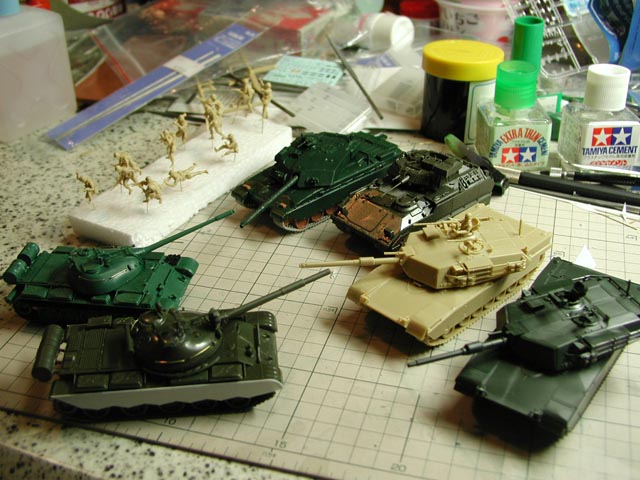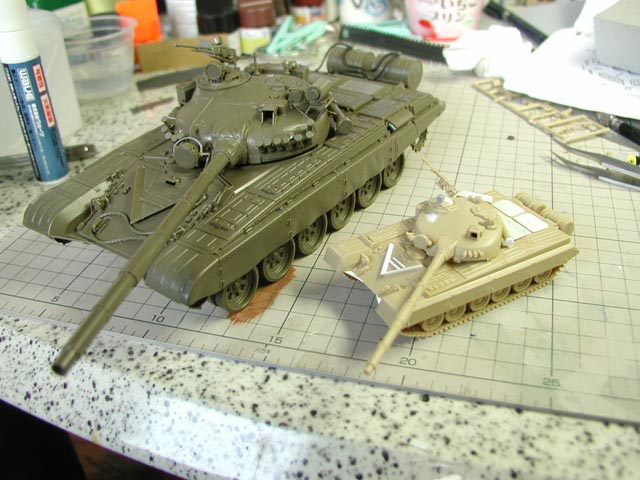 | 最新鋭のT-72戦車のミニスケモデルは存在せず、T-80の先祖返り安直改造です このミニスケールの改造のためだけに、タミヤ1/35のT-72を購入して素組みです。 |