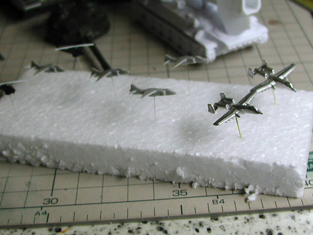 | 全て1/700で揃えました。手前からB-52、B-1、B-2も見えますね。 手前中段にいる真っ黒な機体はU-2偵察機。まさに何でもありでした。 F-14、F-15、F-18、F-117。本当にこの戦力を使うのか危惧していましたが 2003年3月4日の段階で、ここまで準備していました。 |