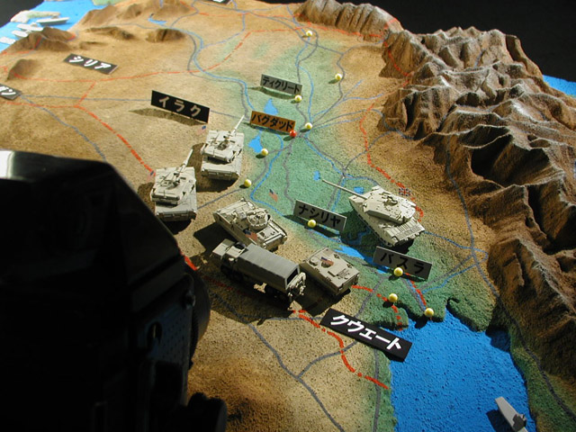 | 結果的に開戦前日の3月19日のオンエアでは、こんな模型が使われました。 塗装色を微妙に変えて模型上で敵味方を識別させました。 |