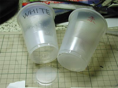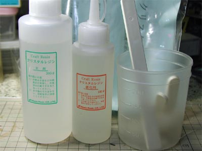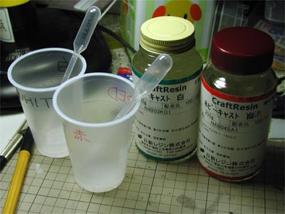 | 計量して100円ショップで購入したプラスチックコップに移す。 | 同量を混合してすぐに型に流し、フタをします。 |