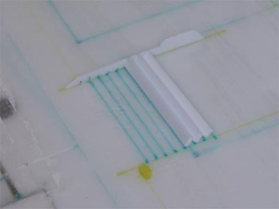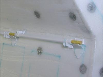| ボンネット上のこんなパーツもコツコツ自作。 | 半透明のポリプロピレン板で押さえ、気泡が無いか確認。 |