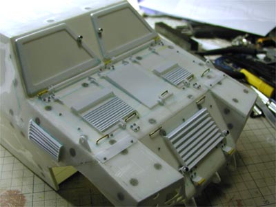| 後から振り返ると、この日はゴールデンウイーク中の平日金曜日。休日出勤多数の当研究室助手は、ここぞとばかりにこの日に代休を取り、まさに朝から晩までただひたすら作っていました。 2日前から始まったボディー細部パーツの自作は、その場その場で「さて、次は○○だ。どんな材料を使おうかな?」といった風に進めておりました。途中から、ある意味感覚が麻痺してきており、無意識に手が動いていた記憶もあります。手すりも真鍮線の太さを変えながら適宜作り、リベットも都合5種類の大きさから選択して接着していき、一気に完成しました。 車体前部左右に付くサイドルーバーの貼り方にはコツがありました。ルーバーの枚数は全部で6枚。実はこの6枚は平行に並んでいるのではなく、前方側の間隔が微妙に短く、扇形を切り取ったような形になっているのです(つまり微妙な放射状)。当然、正確に測定した印に沿って接着していけばいいのですが、極細油性ペンでマーキングしている現状では微妙なズレ(おそらく0.1mm単位)があるとかなり気になってしまいます。そこで「最初に上端と下端のルーバーを接着し、間を均等に目分量で貼る」という考え方が出てきます。しかし6枚のルーバーだから間に入るのは4枚(偶数なのがポイント)で、これを均等に貼るのは大変です。 そこで次の方法で乗り切りました(ルーバーを上から順に1〜6と番号をつけます) a) 2番と6番を正確に位置決めして接着します b) 4番を正確に2番と6番の中間に接着 c) 3番を2番と4番の中間に、5番を4番と6番の中間に接着 d) 2番〜6番の間隔を見ながら慎重に1番を接着 e) ルーバーの縦棒にあたる部分の1番の上部分を微調整してカット 目分量といってバカにしてはいけません。寸法を正確に測る事は出来なくとも、「中間にあるかどうか」においてはとてつもなく正確(それこそ今回のケースでは0.1mm単位の精度)なものを出してくれます。このやり方は「常に中間に貼る」という作業の繰り返しのため3枚、5枚、9枚といった枚数の場合に有効です。そうでない枚数の場合は、今回のように逆転の発想で「5枚で作ってから1枚足す」とすれば上手くいきました。もちろんルーバーが単純に平行に並んでいる場合は、印に沿って接着するだけで十分でしょう。今回のように放射状に等間隔といったケースではこのやり方の方がよろしいかと思います。 実は、偉そうに書いていますが、最初は車体右側のルーバーで単純に6等分(0.1mm単位でマーキングできたかは自信がありません)に測定して上から順に貼っていったのですが、どうしても上手くいかず、悩んだ上に編み出した(それほど大袈裟なものではない)方法なのです。しかしこの方法を使った車体左側のルーバーは納得のいくできになりました。文字で長々と説明してどれだけの方に理解してもらえるか自信がありませんが、もし同様の事をする場面になったら、この意味が少しでもわかってもらえるかと思います。といったわけで、後で出てくる車体右側の途中画像を見てもサイドルーバーには寛大な心でお願いします。 ところで、この日、長らく悩んでいたドアの表現についにメドが立ちました。ギザギザリムの表現はなんとかプラペーパーで乗り切りましたが、肝心のリム本体の四隅の表現の発想を実行に移す事に成功したからです。リム本体の直線部分はエバーグリーン社の1mm×2mm棒がピッタリなのが判明したのですが、肝心の四隅(実際には五角形なので五隅)の曲線はローソクの炎であぶって曲げるとしたら精度がなあ〜と悩んでいました。そしてついに、「そうだ!サークルカッターで小さな同心円を作り、切断すればいいんだ!」と気付いたのです。例によって後から見れば「なんでそんな事で大騒ぎしてるの?」と思われるでしょうが、当時のワタシにとってはまさに画期的な発想でした。「でも四隅でなく5箇所あるし・・・」との思いは4等分したうちの一つのパーツを30°と60°に切断すればなんでもない(何箇所に分かれていようと、1周合計360°になるのは考えてみればあたりまえ)ことがわかり一安心です。 リムの幅は2mmですので、2mm幅のドーナツ状の物を切り出さなければなりません。サークルカッターの最小半径は5mmですので、5mmと7mm半径の円を切り出したところ、これまた四隅(五隅)にピッタリ合います。「神様っているんだなあ〜」と感動していたものでした。 仮組みが終わったので、早速製作に取りかかります。まずは0.14mmプラペーパーで切り出したものを慎重に位置決めして貼ります。そして上記のドーナツ切断パーツを五隅に貼ってから、間をエバーグリーンの棒を現物合わせで貼っていきます。出来上がってみると想像以上にきっちりとしたものになりました。しかしこのままではまだまだエッジが立ちすぎていて不自然です。この削り込みに関しても、またまた新たな新兵器(?ただし100円ショップで購入)を使う事になりました。それは翌日のことです。 (2004/09/10) |