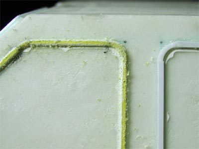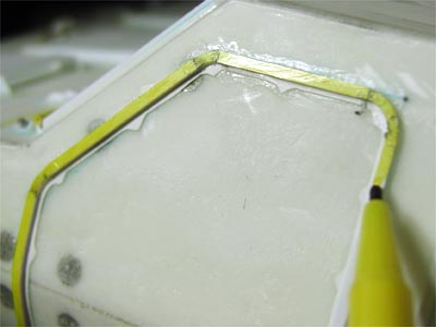 | どこまで削るか判り易くするために油性マーカーで着色。 | このままでは隅に少々歪があることもわかります。 |