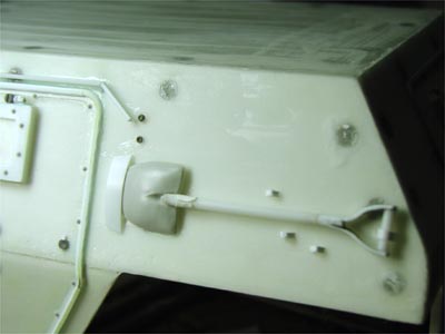 複製したドアヒンジに、パーツ(銀色部分)を追加接着。 複雑な角度の車体との固定はエポキシパテで。 |