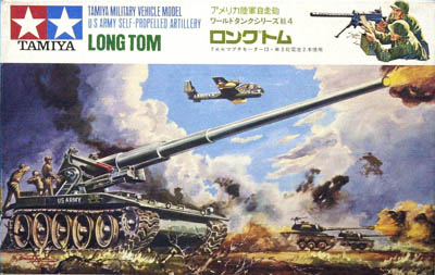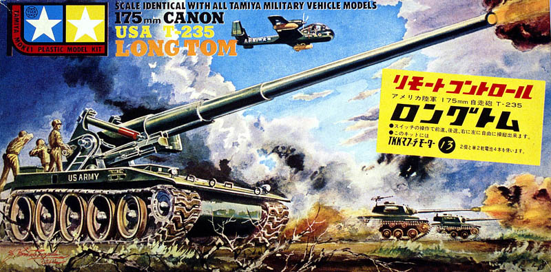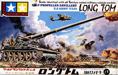 | 突然、15年近く前の宿題をやります。ワールドタンクシリーズのロングトムです。 1962年1月に1/35パンサータンクを発売して起死回生の大ヒットさせたタミヤですが、2の矢、3の矢を忘れなかったところが流石です。それは年長者対策と年少者対策でした。小学校高学年から中学生以上の年長者には定価が1300円もする1/21M4シャーマンを1963年3月に発売し、年少者にはノンスケールの100円タンク、ワールドタンクシリーズをスタートさせました。ちなみにワールドタンクのシリーズNo.1とNo.2にあたるM-42ハンターとSU-57スターリンのシングル初版は1962年12月に定価150円でスタートしましたが、1963年6月に100円に値下げされました。 そんな中ワールドタンクシリーズのリモコン版(ベビーリモコンシリーズと命名)として1963年2月に最初に発売になったのが、このT235ロングトムです。TKK13モーターを2個、直接車体下部側壁にネジ留めする大胆な構成で、超信地旋回も含む本格的な操作が可能でした。さらに4ヶ月後の1963年6月にはシングル版も発売されました。ボックスアートは小松崎茂画伯の迫力あるもので、リモコン・シングルとも同じボックスアートが使用されました。なんて、いつもの様に書いてますが、これって全て50年以上前の話になってしまったことに愕然としませんか?(笑) 当研究室助手はこのキットに深い深い思い出があります。田宮模型歴史研究室開設のきっかけにもなったキットなんです。 時は1993年の秋でした(もう20年以上経つんですね)。当時、ホビージャパン誌に毎号広告を出していた某絶版模型通販ショップで何かを購入した折に「今度こういう同人誌を作られた方がいらっしゃるんですよ」と同封されてきたのが同人誌『プラモデル・レテ』の告知チラシコピーでした。それは絶版模型に特化した同人誌だというのです。「!こんな本を!しかも個人で!!」すぐに購入を希望する旨の手紙を著者に直接出しました。住所は意外にも近所で、我が家から電車で3駅程の個人宅でした。 程なく送られてきたこの本は、私の想像をはるかに超えていました。絶版となった古いプラモデルのパッケージと組み立て説明書の複写、そしてその詳細な解説の本だったのです。今となれば大手出版社からそういった類の本はカラー写真満載で何種類か発売されていますが、当時は全く無く、まさにパイオニアの本でした。ウィンドウズ95も出ていない時代ですので、ホームページどころかメールというツールさえも皆無に等しい時代です。もちろんこの「田宮模型歴史研究室(1998年開設)」も存在していません。 熟読すると感動は増すばかり、何と言ってもその解説文の内容でした。タミヤだけでも1/21M4シャーマン、クルセイダー、1/35サラディン、レコードカーブルーバードを取り上げ、他社製品未含めて合計36点ものキット紹介です。その一つ一つの解説が豊富な知識とプラモデル愛とウイットに富んだもので、しかもいわゆる高額お宝キットを狙った「こんなの持ってるんだぜ、どうだ羨ましいだろう」といったものでは全くなく、チープキットも分け隔てなく同格に扱っています。当時はプロの出版社以外の装備では印刷技術が低く、パッケージをそのままコピー印刷するとグラデーションが出なくて潰れた印刷になってしまうのですが、リコー社の新製品の網掛け印刷で当時としては画期的に綺麗な印刷になっています。また、同人誌にもかかわらず、掲載にあたって全ての模型メーカーに許可取りまで試みてありました。同封されていた著者直筆の長文の手紙を拝読し、書かれていた番号におそるおそる電話を掛けてみました。「一度お会いしませんか?」 時に1993年12月のとある週末、先方にはご家族がいらっしゃるのでお昼時は避けて12:30にアポを取り、話のネタにと自宅にある手持ちの絶版キットを入るだけ手提げ袋に詰め込んで訪問しました。インターネットやメールもなかった時代、こういった絶版プラモデルを集めている知り合いは周りには皆無、模型雑誌の売ります買います欄で往復はがきや返信用封筒を入れての地道な活動がメインでした。「ああ、初めて同好の士に会えた」の思いで、あっという間に20年来の友人に再会した気分になり、お互い持ち寄ったキット(先方は自宅から無尽蔵?に出てくるキット)をサカナに話が進み、結局奥様の手料理の夕飯は頂くは、お酒もごちそうになるはで、家をおいとましたのは26:00(!)頃だったかと思います。これが現在のUMA動く模型愛好会世話役の一人「ねこにいプロダクツ・オヤヂ博士」との出会いでした。 実はオヤヂ博士さんは幼少の原体験でタミヤのワールドタンクのロングトムを3回も作った経験があり、一番思い入れの深いキットの一つなのですが、当時はすべて処分されてしまい、プラレテで取り上げたのは同じワールドタンクシリーズのクルセイダーだったのです。表紙に手描きイラストでも紹介されたオヤヂ博士のワールドタンクシリーズへの熱い思いはビンビン伝わり