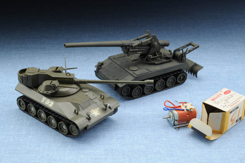 | 「タミヤの動く戦車模型大全」のためにスタジオ撮影。車体下部共通のT92デストロイヤーと。 |