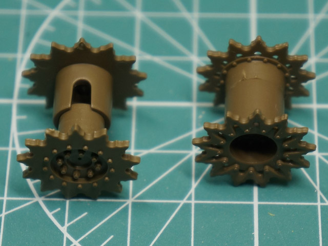 | 左:M4A3シャーマンに不要部品として入る“ディスプレイ用”の起動輪パーツと組み合わせ 右のビッグショット純正起動輪の幅を稼げることが判明し、左側の組み合わせから幅を縮める。 |