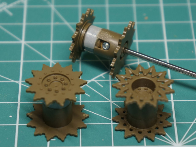 | 左:起動輪の完成。右側のM40ビッグショット純正品と全く同じ幅に。 六角シャフトを通してオリジナルのイモネジで固定。 |