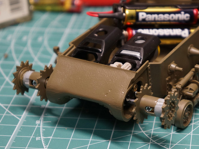 | 左:ミニ四駆の標準六角シャフト 右:1/35M4A3シャーマン用の六角シャフト 短い方の直径で前者は1.77mm、後者は2.26mm。 タミヤでの正式名称はそれぞれ2mm六角シャフト、2.5mm六角シャフト つまり最初の段階でスプロケットホイルにミニ四駆の六角ギヤーを埋め込んでいたら 大変なことになっていました。ケガの功名です。 |