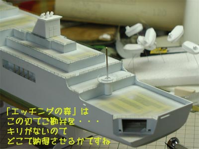 | 締め切りが延びた→時間をかけられる→思う存分手を加えられる となるのですが、どこかでふんぎりをつけなくてはなりません。といっても自由な発想で色々とやってみました。 救命艇の噴射口は原型段階では2mmプラ棒で作っていましたが、キャストの抜けが悪くなるということで外し、複製が出来てからそれぞれ2mmパイプを接着しました。そこにさらに1/350駆逐艦フレッチャーの機銃用のパーツを接着します。厳密には違うのですが雰囲気はぐっと良くなりました。 こんな感じでエッチングパーツから使えそうなパーツを捜しては、アイデアを駆使して(?)作っていきます。普通のパーツでは出来そうに無い部分も想像力をたくましくして使います。だんだん仕上がりが楽しみになってきました。 |